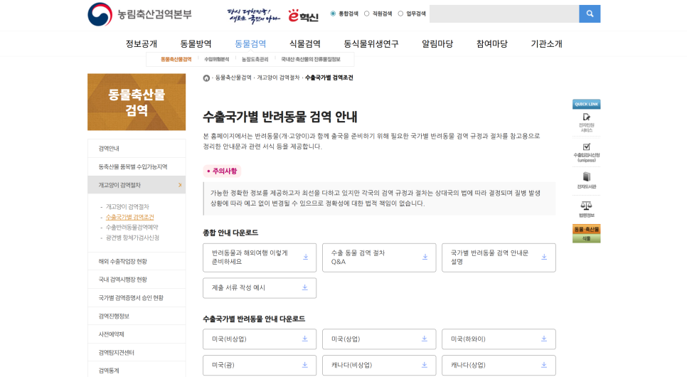 수출국가별 반려동물 검역 안내 본 홈페이지에서는 반려동물(개·고양이)과 함께 출국을 준비하기 위해 필요한 국가별 반려동물 검역 규정과 절차를 참고용으로 정리한 안내문과 관련 서식 등