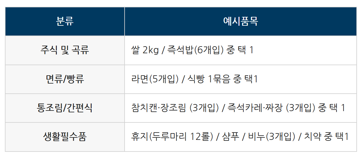 - 쌀, 마스크, 라면, 통조림, 휴지, 비누, 목욕용품 등으로 구성