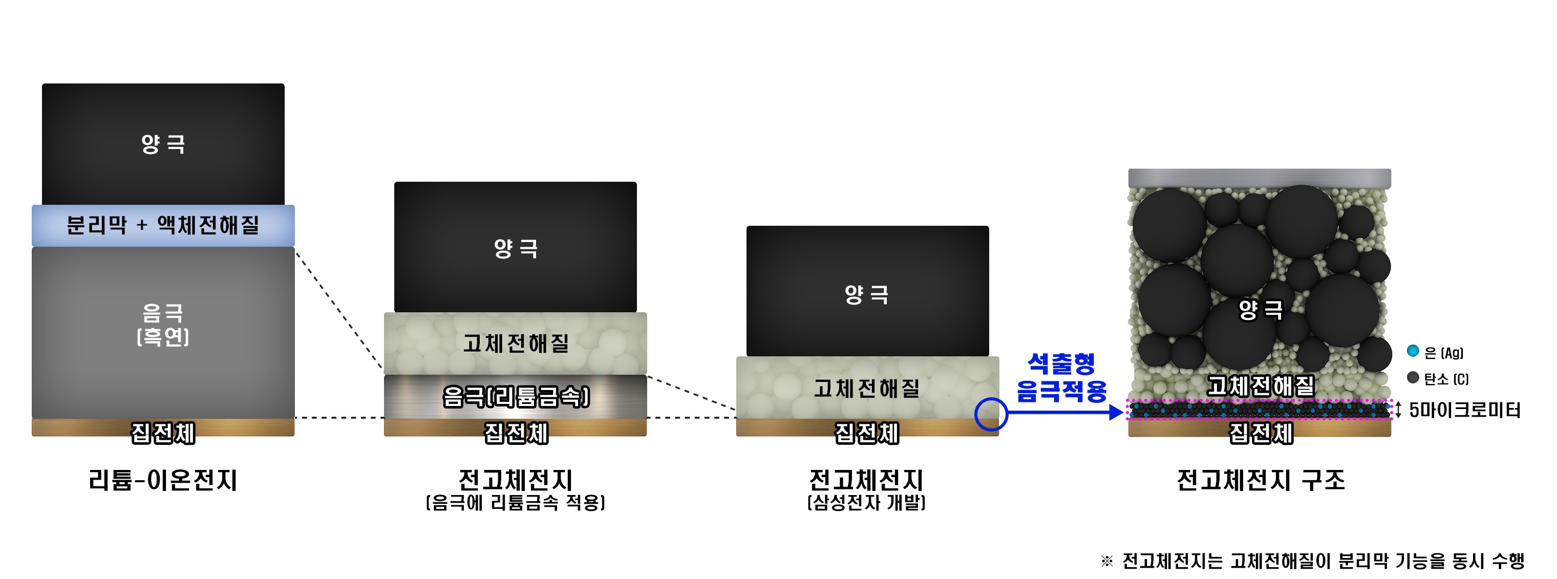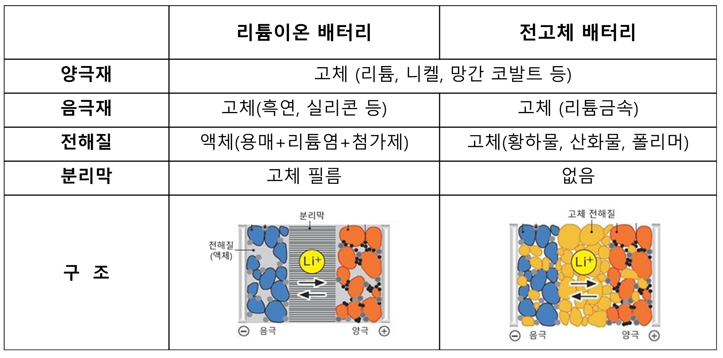 리튬이온 배터리는 양극과 음극 사이에 접촉을 방지하는 분리막이 위치하고 액체 전해질이 양극, 음극, 분리막과 함께 있지만, 전고체 배터리는 액체 전해질 대신 고체 전해질이 포함되면서 고체 전해질이 분리막의 역할까지 대신하게 됩니다.