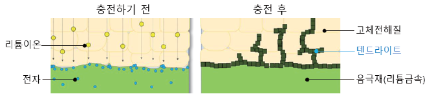 *덴드라이트 리튬금속 표면에 나뭇가지 모양으로 쌓이는 결정체입니다.