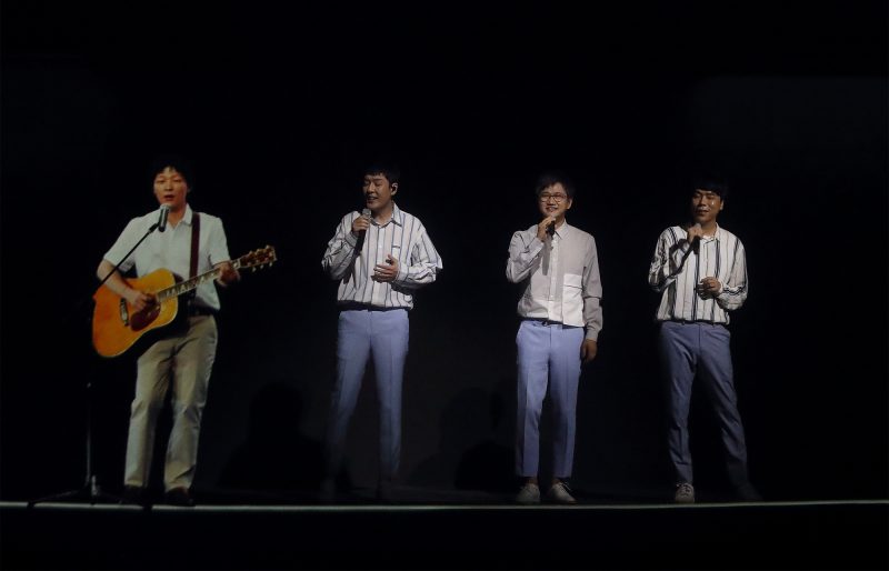 남성 보컬그룹 스윗소로우가 유재하의 유작 ‘지난날’을 부르던 중 유재하가 무대에 등장합니다. 홀로그램 기술은 30여 년 전 유재하를 현실로 불러냈습니다. 미래형 음악서비스의 대표적인 예입니다.