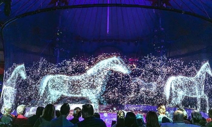 1976년부터 다양한 동물을 이용한 쇼를 해온 독일의 유명 서커스단입니다. 하지만 최근 서커스 업계의 동물 학대 관행에 반대하며 3D 홀로그램을 이용한 동물 쇼를 내놓았습니다. 코끼리와 말, 심지어 초대형 붕어까지 등장하는 서커스 론칼리의 동물 쇼인데 '진짜 동물'은 한 마리도 동원되지 않습니다. 너비 32m, 높이 5m의 대형 서커스장을 3D 홀로그램 동물들로 가득 채운 서커스 론칼리 모든 관객이 쇼를 즐길 수 있도록 360도 그래픽을 만들어냈습니다.