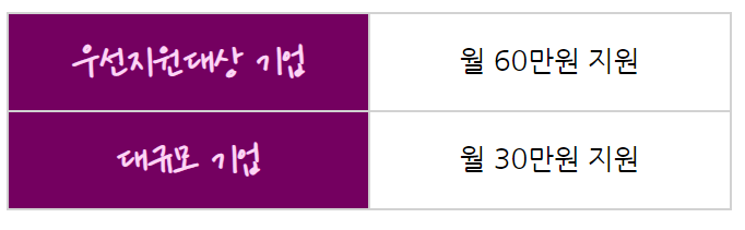 우선지원대상기업과 중견기업 사업주에게 전년도 말일 피보험자 수의 30% 한도로 최대 30명 이내로 1인당 월 20만원 지원
