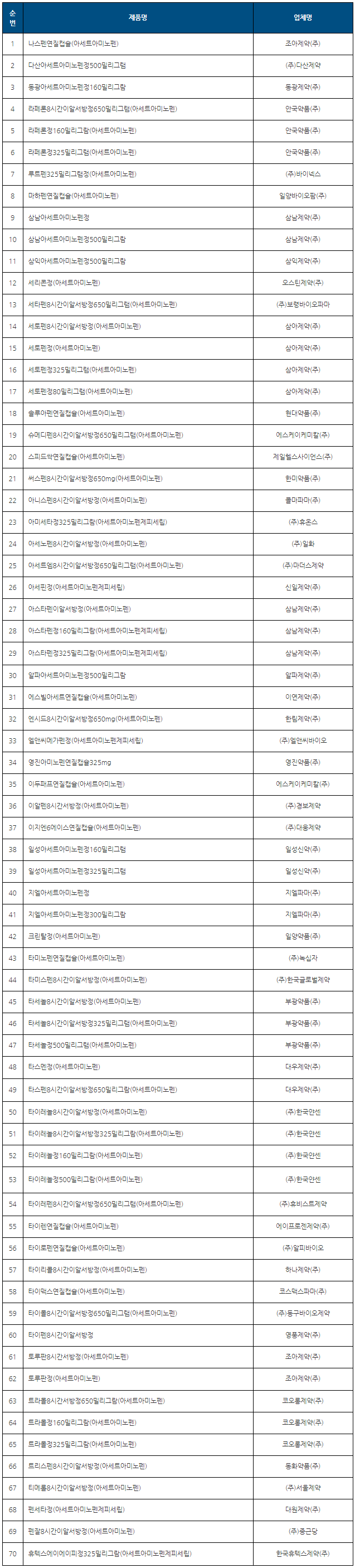 현재 국내에 유통·허가된 ‘아세트아미노펜’ 성분의 해열·진통제는 무려 70여 종으로 매우 다양합니다. 따라서 일부 품목이 품절되었어도 '아세트아미노펜'이 있는 다른 제품을 선택, 약사의 복약지도에 따라 복용하셔도 됩니다.