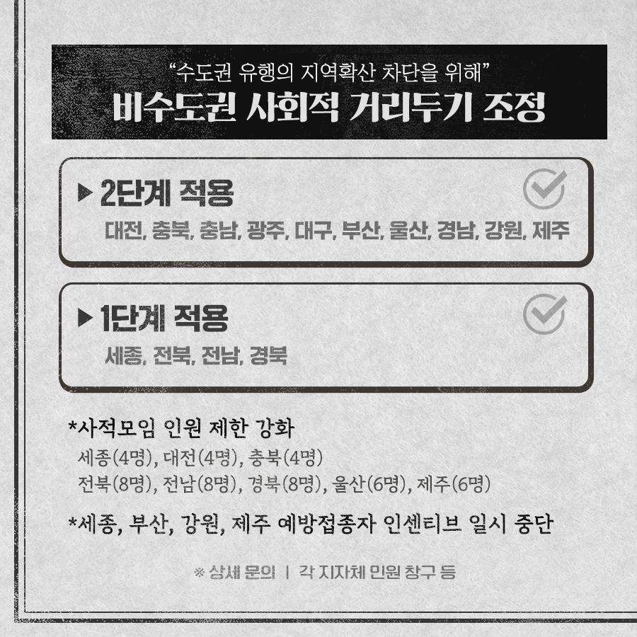 비수도권의 사회적 거리 두기 단계를 2단계로 조정합니다.