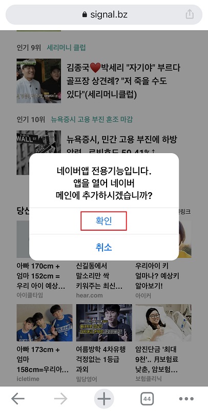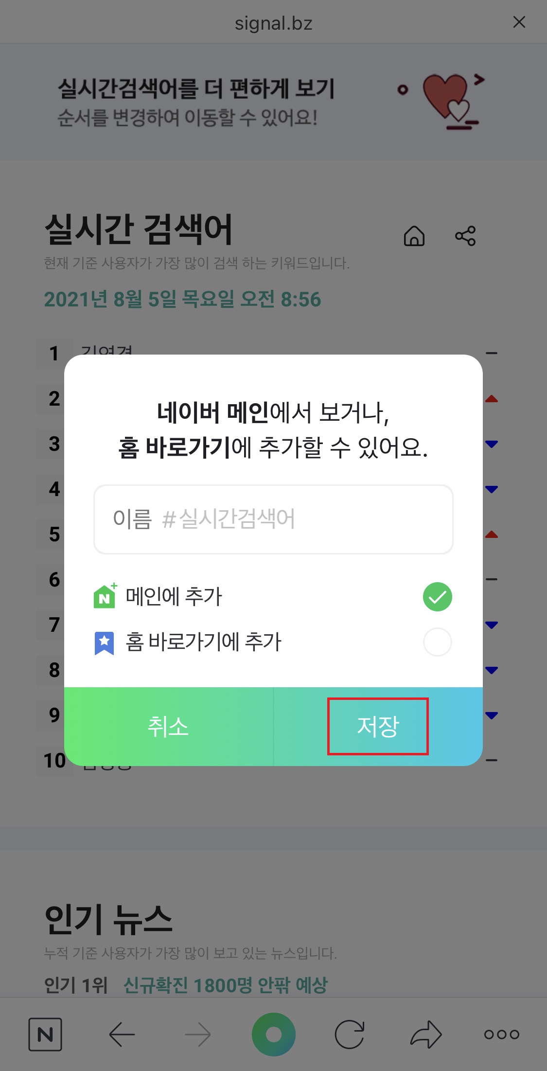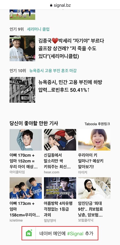 2. 브라이저 제일 하단 '네이버 메인에 #Signal 추가' 버튼을 누릅니다.