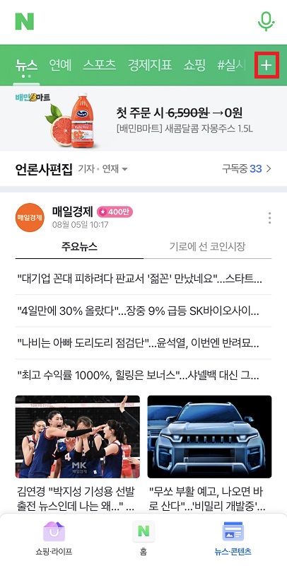 1. 네이버 앱을 열고 "+" 버튼을 누릅니다.
