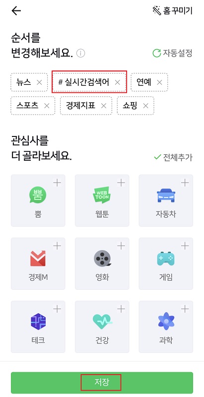 2. 메뉴를 길게 눌러서 순서를 변경하고 '저장' 버튼을 누릅니다.