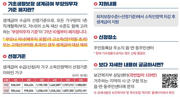 오는 10월부터 근로 능력이 없는 등 생계 활동이 어려운 노인과 장애인, 한부모가구 등 저소득 취약계층에 대한 생계급여의 부양의무자 기준이 60년 만에 없어진다. 이에 따라 앞으로 수급가구