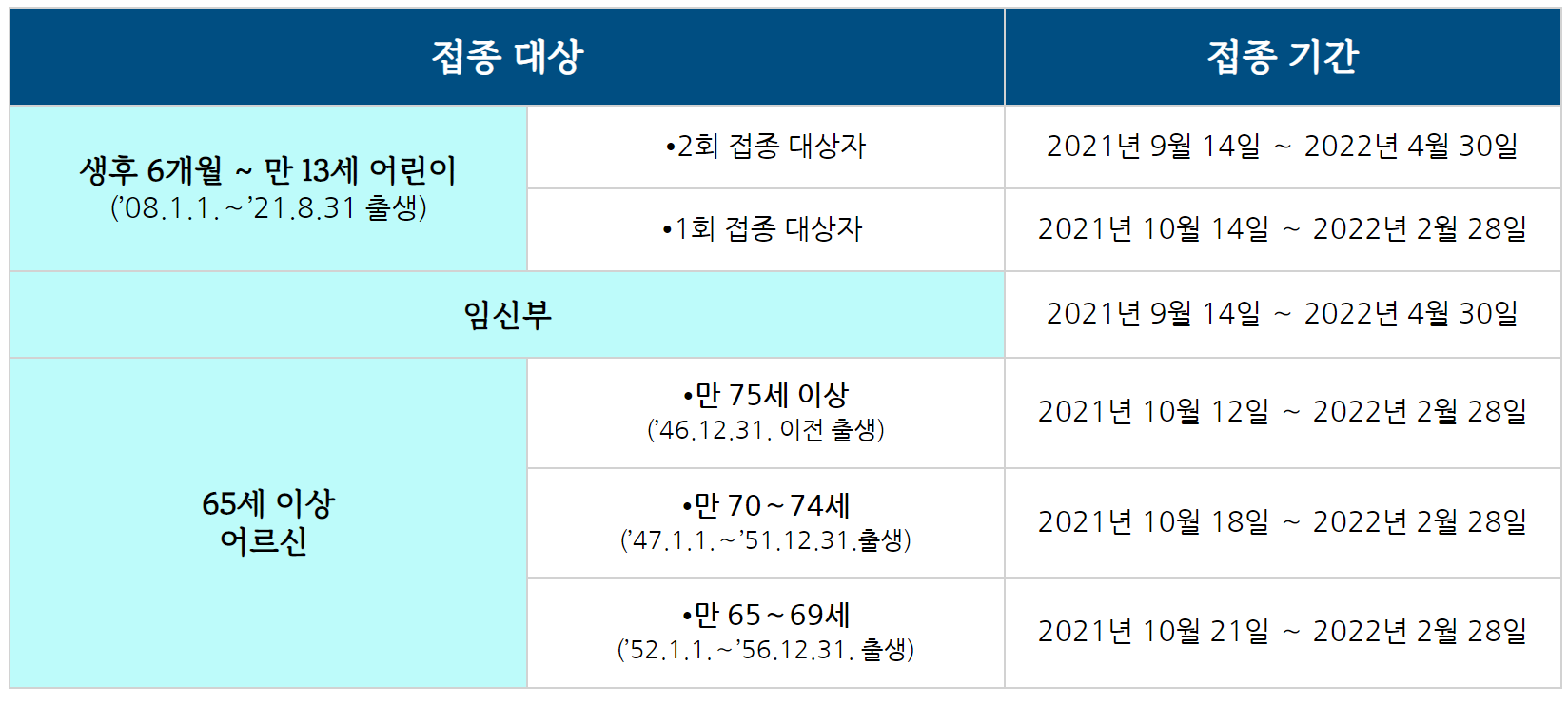 독감 인플루엔자 무료예방접종 대상자별 접종일자 (9.14.~)