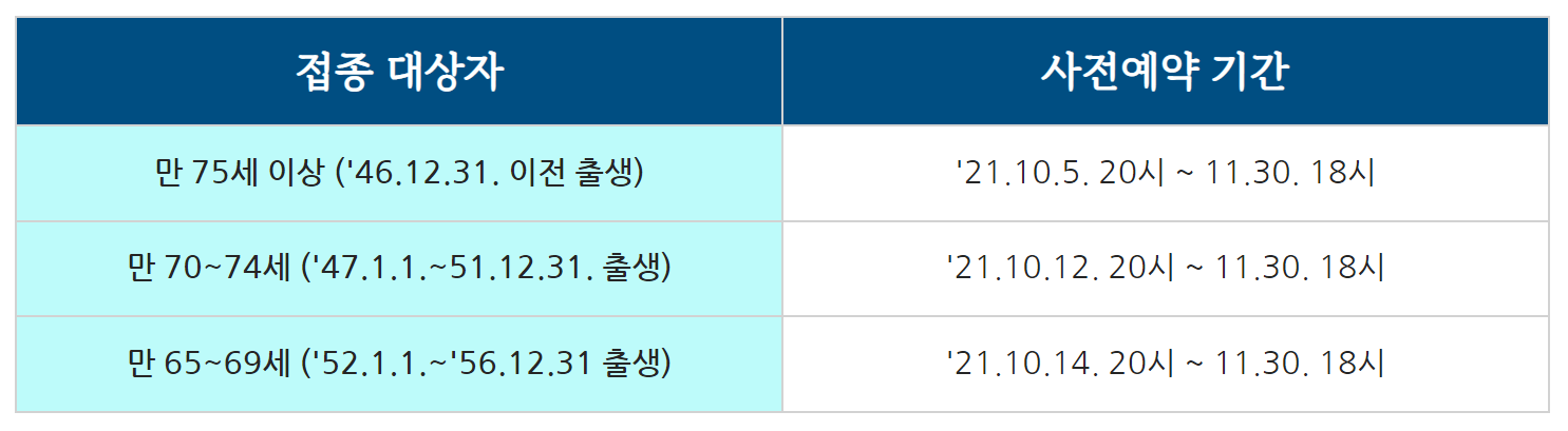 대상 인원이 많은 만 65세 이상 어르신은 접종자가 몰리지 않도록 연령대별로 예약 후 접종 시작합니다.