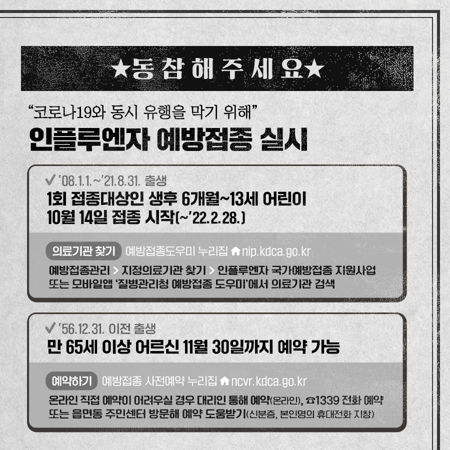 올해는 코로나19 예방접종과 동시에 진행되기 때문에 대상별 일정을 반드시 확인하고 예방접종 받으시기 바랍니다.