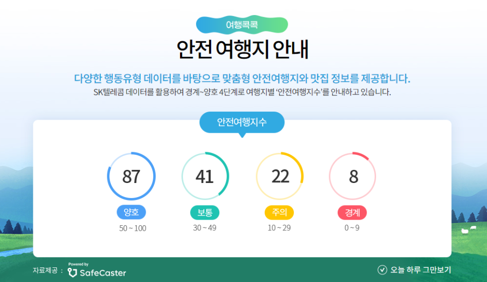 여행지 혼잡도 데이터를 기반으로 양호-보통-주의-경계 4단계로 안전 여행지수를 안내하고 지역별 안전여행 및 맛집 정보를 제공하고 있습니다.