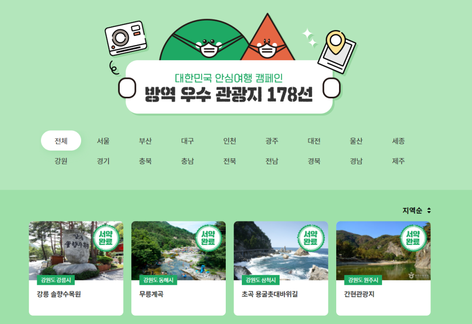 코로나19 안전을 위해 어디로 갈지 고민이라면 방역 우수 관광지에서 안심하고 여행하세요!