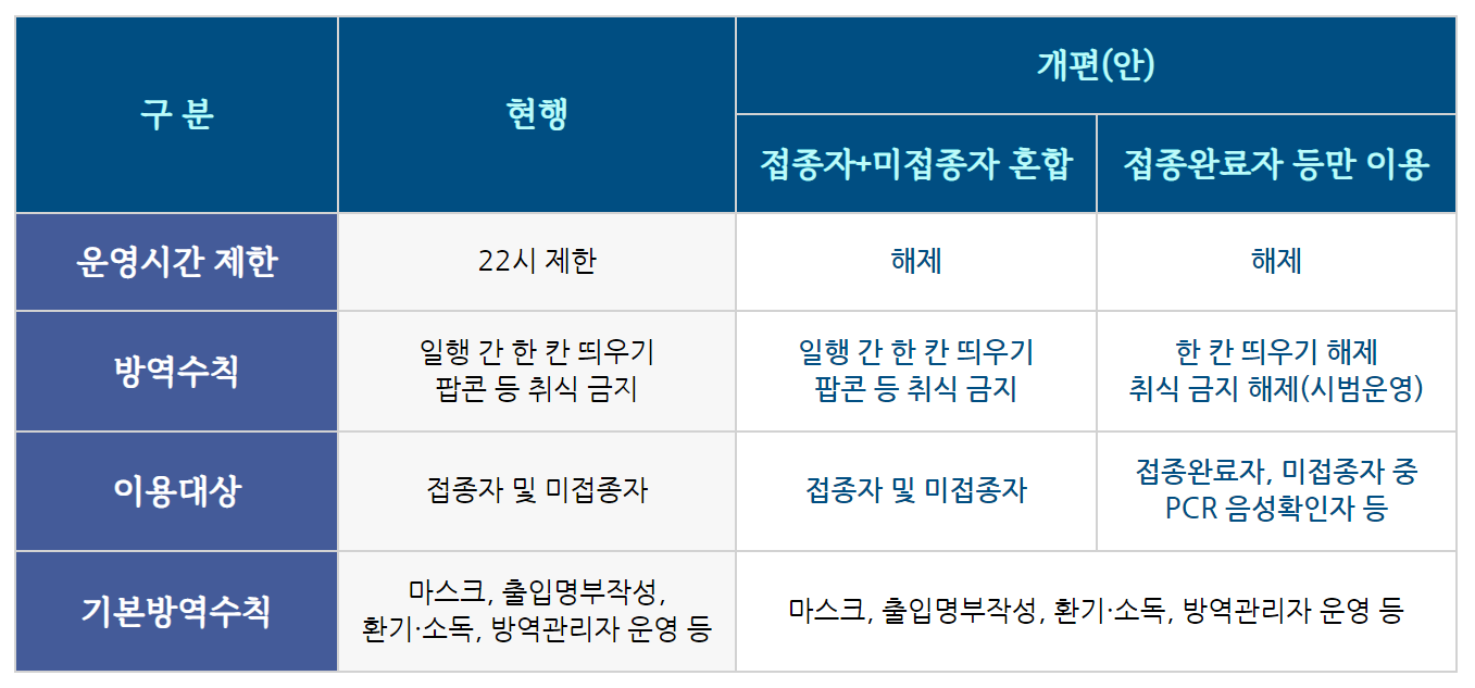 (1차) 운영 시간 및 인원 제한 해제하며 → (2차) 실내 취식 금지 해제 등