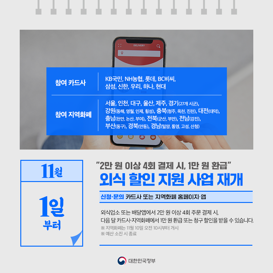 외식 할인 지원을 응모한 카드사 또는 일부 지역화폐를 통해