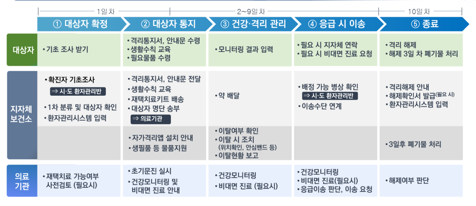 재택치료 대상자로 결정된 후에는 초기 문진과 함께 주의사항과 비상 연락망, 응급상황 시 대응요령 등 생활수칙 즉시 안내하고 재택치료키트 등 물품을 신속하게 지급합니다. 건강상태 모니터링은 일반적인 경우 1일 2회로 60세 이상, 기저질환자, 50대 미접종자 등 집중관리군은 1일 3회 실시합니다. 보호자 관리도 함께 강화해 의료진이 보호자의 건강이상을 감지하면 비대면 진료를 안내하고 의료서비스 제공합니다.