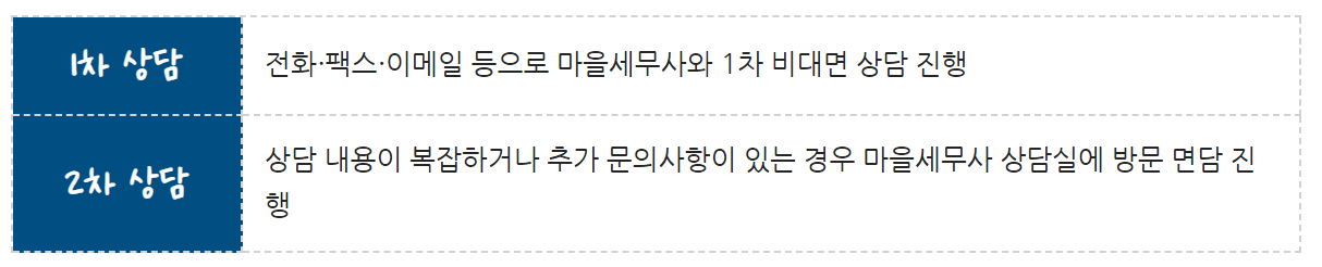 행정안전부와 자치단체 홈페이지, 자치단체 민원실, 읍·면·동 주민센터에서 마을세무사 연락처를 확인 후 상담 신청
