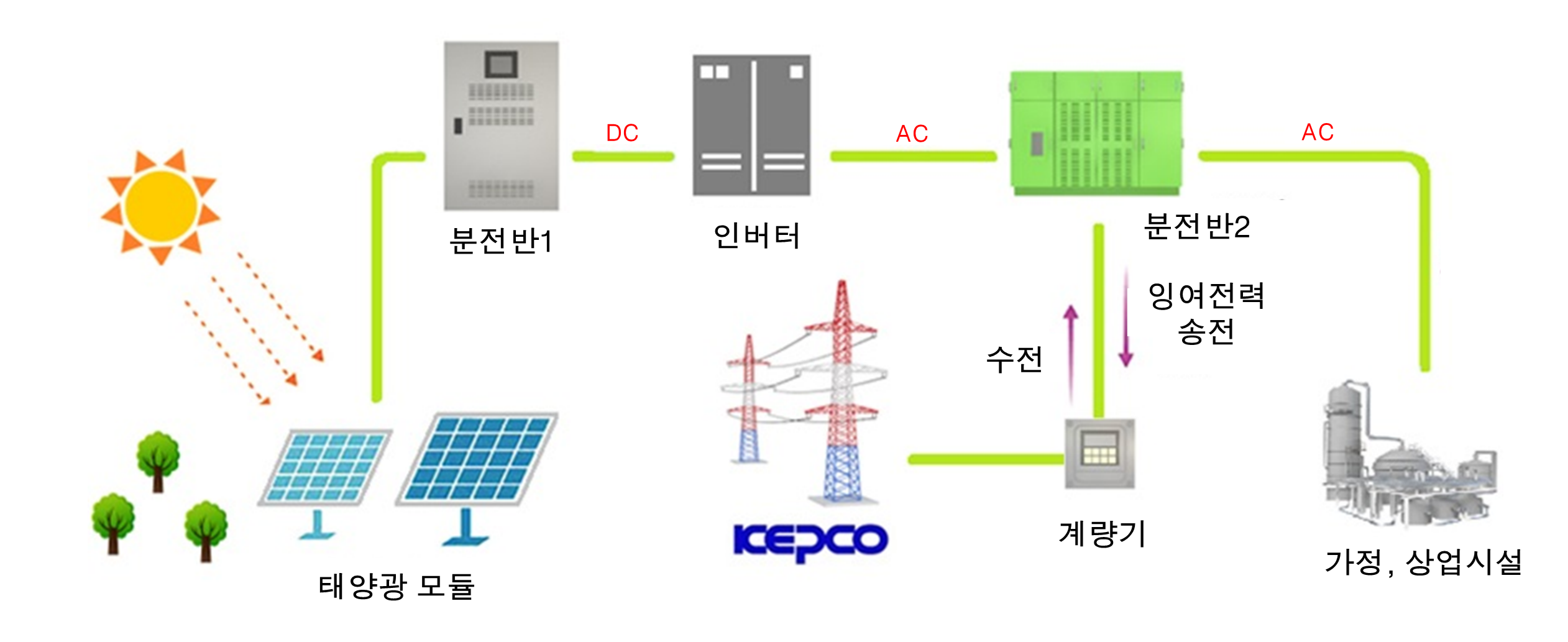직류(태양광모듈 발전) -> 교류(가정, 상업시설 사용) 변환