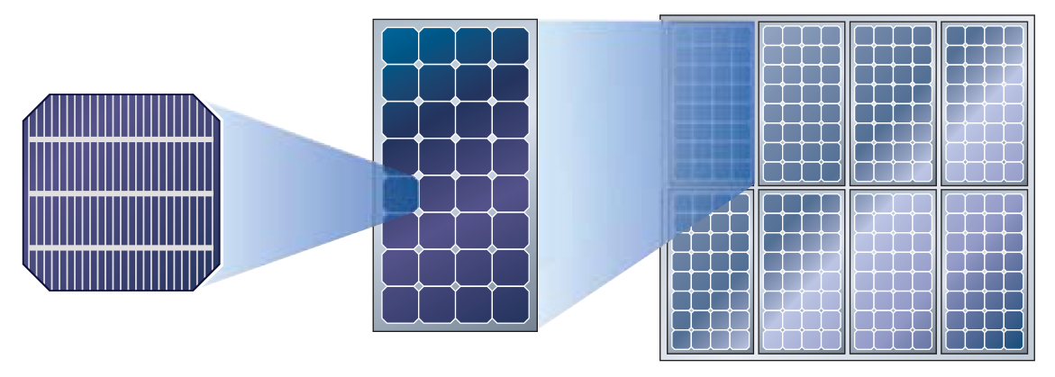 여러 셀을 연결하고 유리와 프레임으로 보호한 것, 필요한 전력을 얻을 수 있는 최소 단위