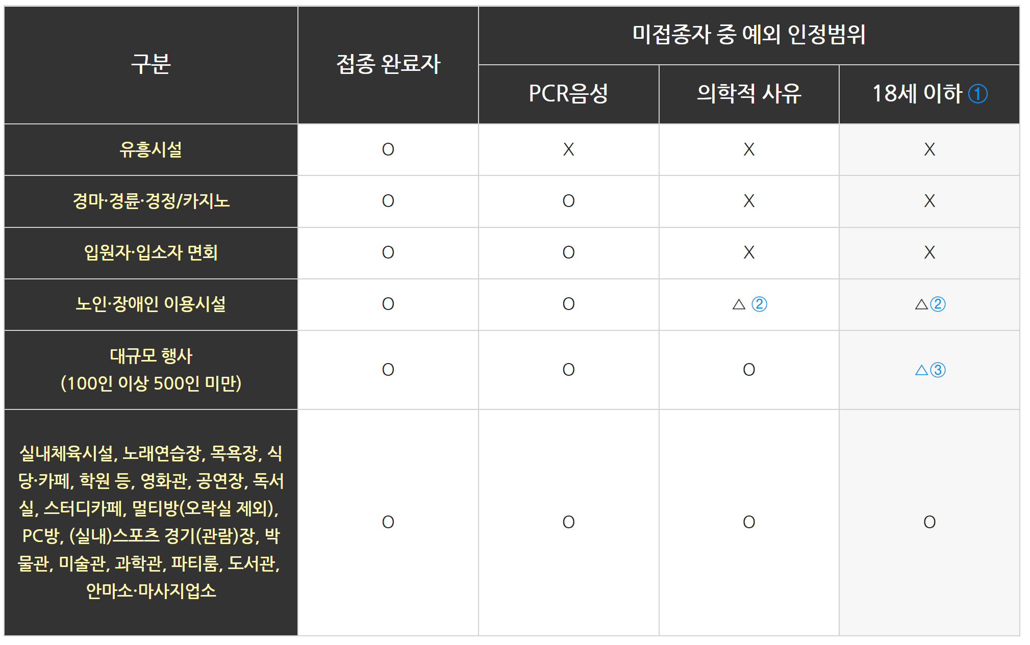 접종완료자, PCR 음성확인서 소지자, 완치자, 만 18세 이하, 의학적 접종불가자 등