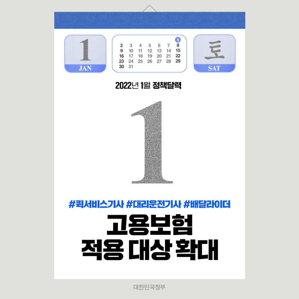 2022년 1월 1일부터 플랫폼종사자인 퀵서비스기사(음식배달기사 포함), 대리운전기사도 고용보험 적용 대상에 포함합니다. 이를 통해, 구직급여, 출산전후급여 혜택을 받을 수 있게 됩니다.