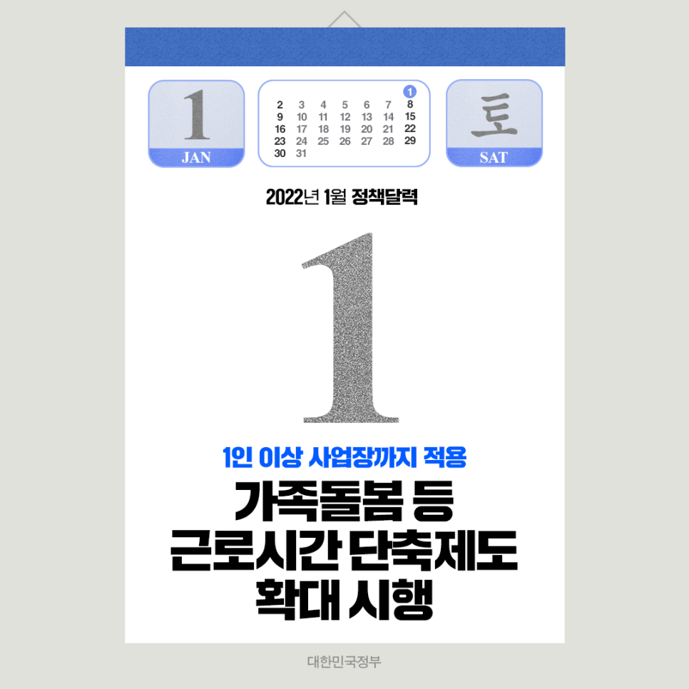 이로써, 2022년 1월 1일부터 가족돌봄 등 근로시간 단축제도가 1인 이상 사업장까지 확대 적용됩니다.