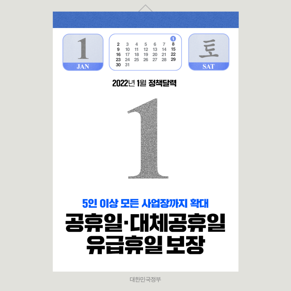 2021년 8월 4일, 「관공서의 공휴일에 관한 규정」 일부개정에 따라 기존 설날, 추석, 어린이날에 더해, 3·1절, 광복절, 개천절 및 한글날까지 대체공휴일로 확대 적용되었습니다. 종전에는 관공서 공휴일이 민간기업의 법정 유급휴일이 아니었으나, '휴식 있는 삶' 확대에 따라 기업규모별로 단계적으로 법정 유급휴일로 적용해오고 있습니다.