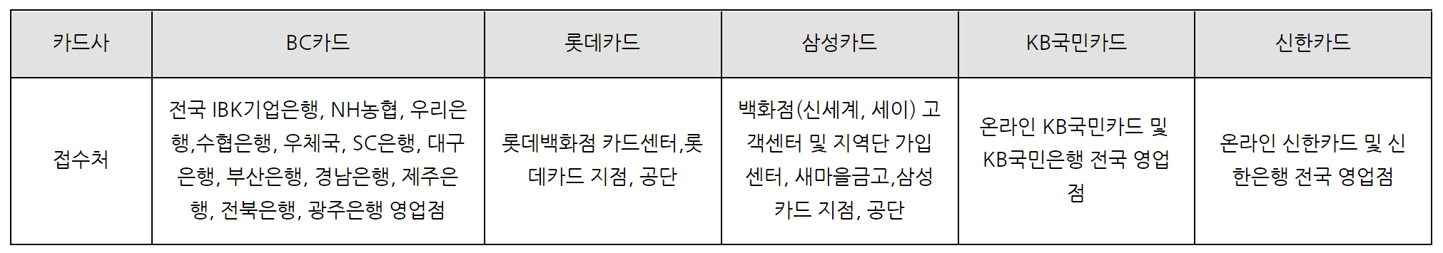 (카드발급 문의) BC카드 콜센터(1899-4651), 롯데카드 콜센터(1899-4282), 삼성카드 콜센터(1566-3336), KB국민카드 콜센터(1599-7900), 신한카드 콜센터(1544-8868)