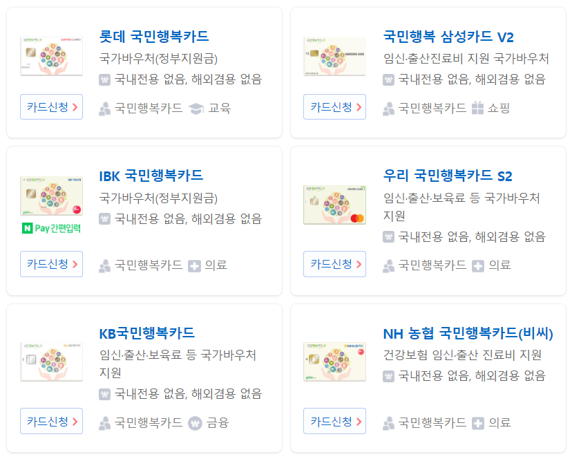 국민행복카드는 정부의 여러 바우처 지원을 공동으로 이용할 수 있는 통합카드입니다. 임신·출산 진료비 바우처 사용은 국민행복카드가 있어야 가능합니다.