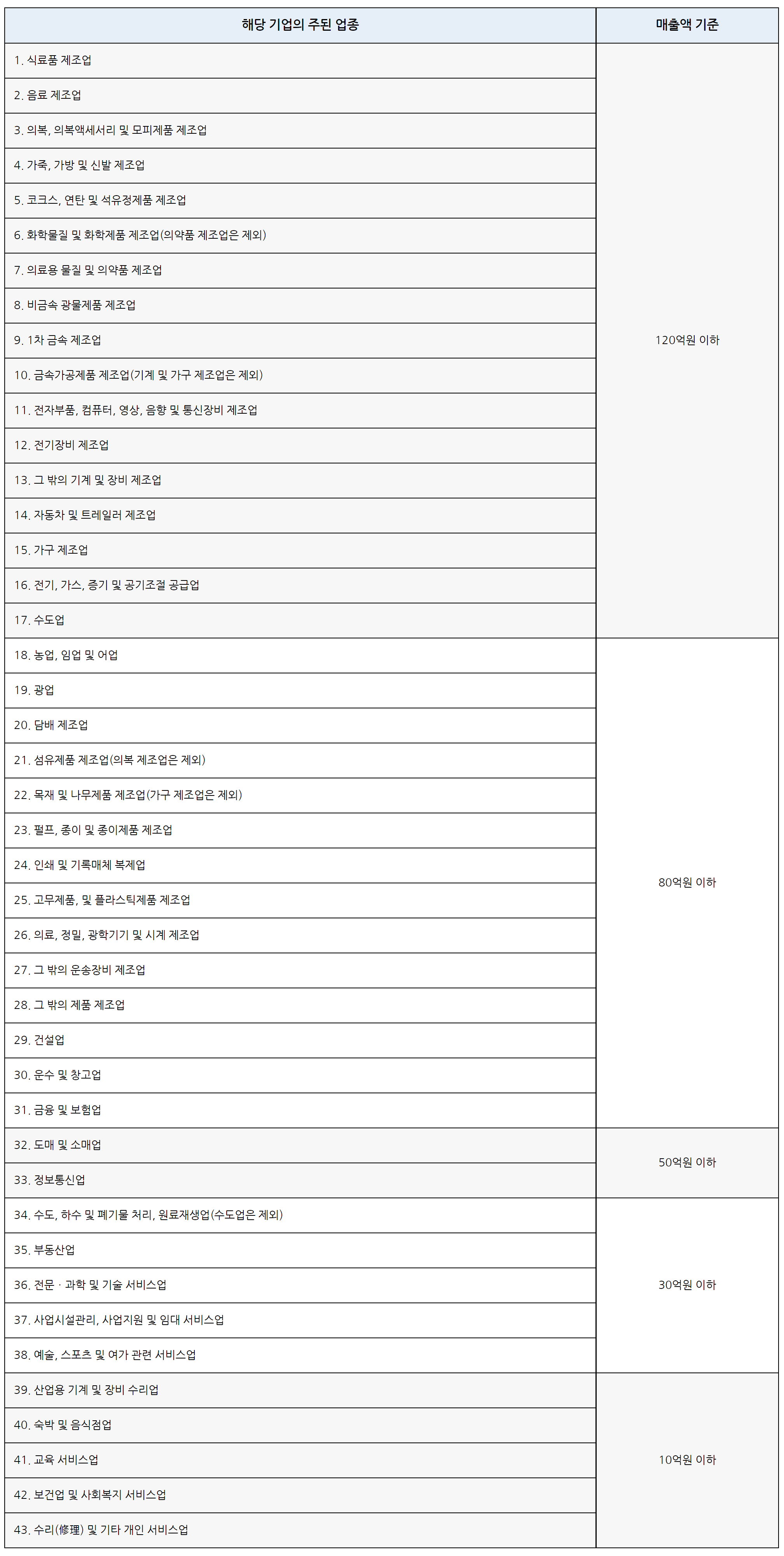 업종별 기준 매출액 10~120억원 이하일 경우 소기업·소상공인에 해당합니다.