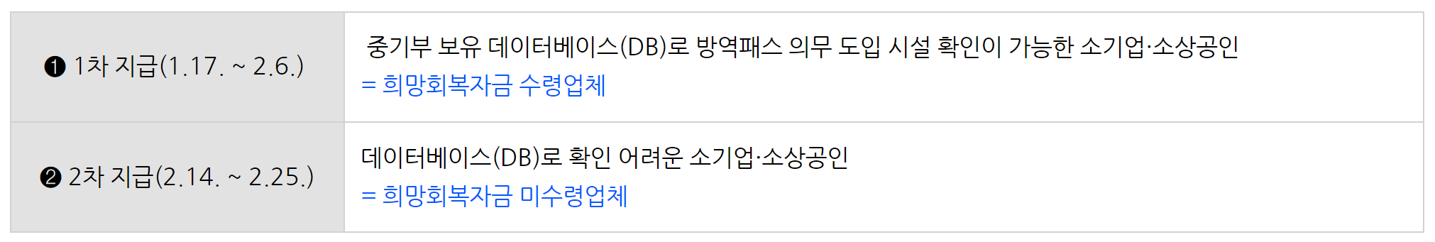 ◦ 신청대상 : 방역패스 적용 소기업·소상공인 중 희망회복자금 수령업체 대상