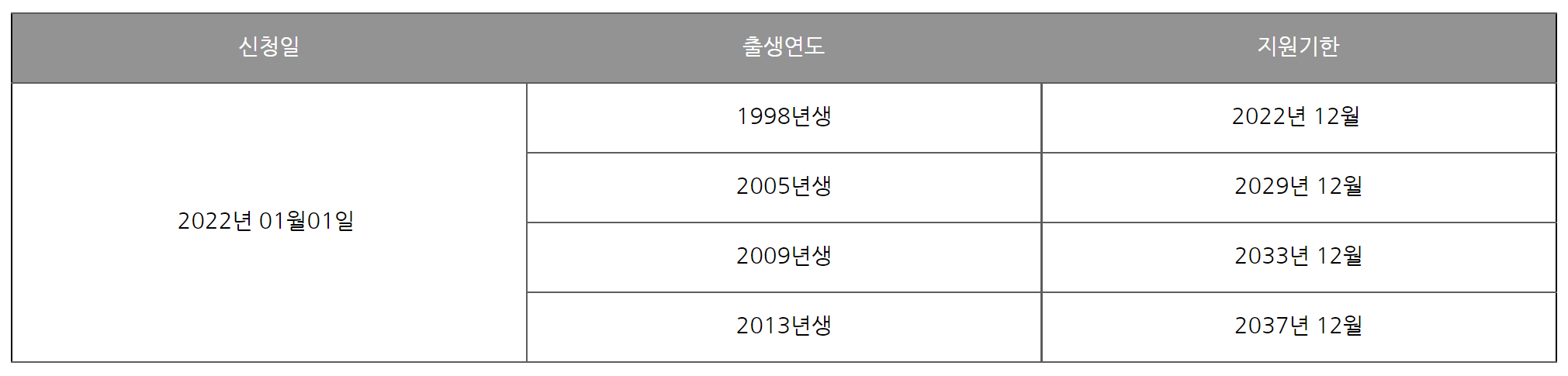 ※ 한번 신청하면 자격에 변동이 생기지 않는 한, 만 24세에 도달하는 해당연도 말까지 계속 지원되므로 기존 신청자는 재신청할 필요 없음
