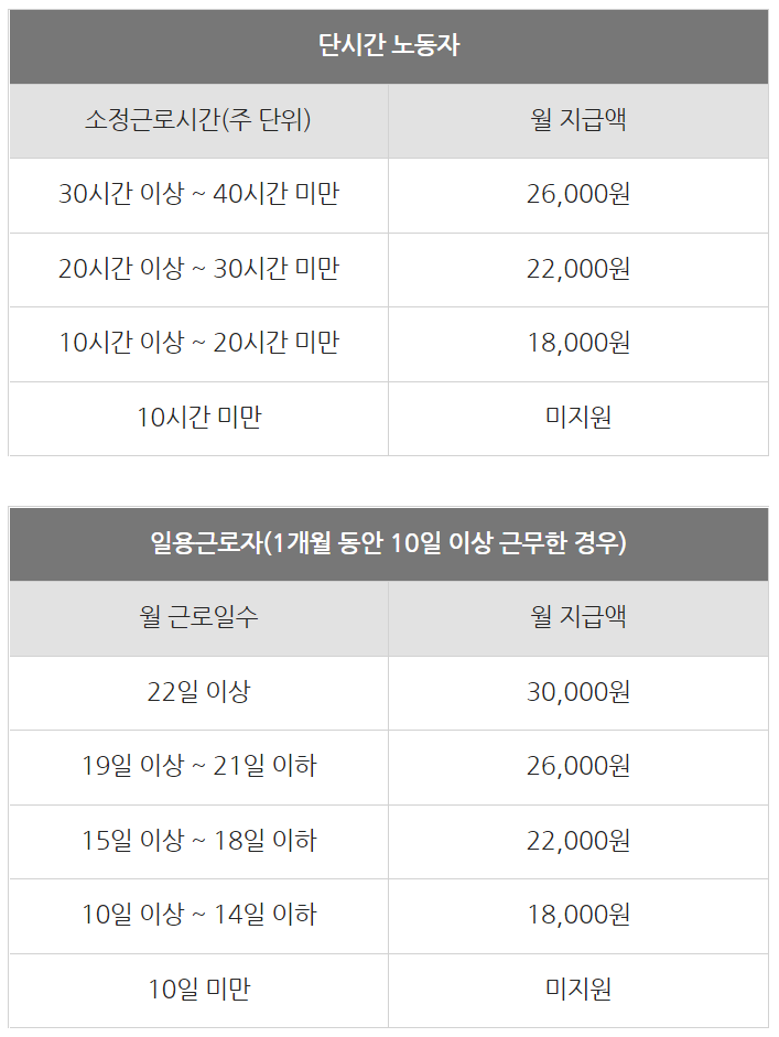 단시간근로자 및 일용근로자는 상용근로자(주 40시간 이상)의 지원수준을 고려해 근로시간 및 근로일 구간별로 지원합니다.