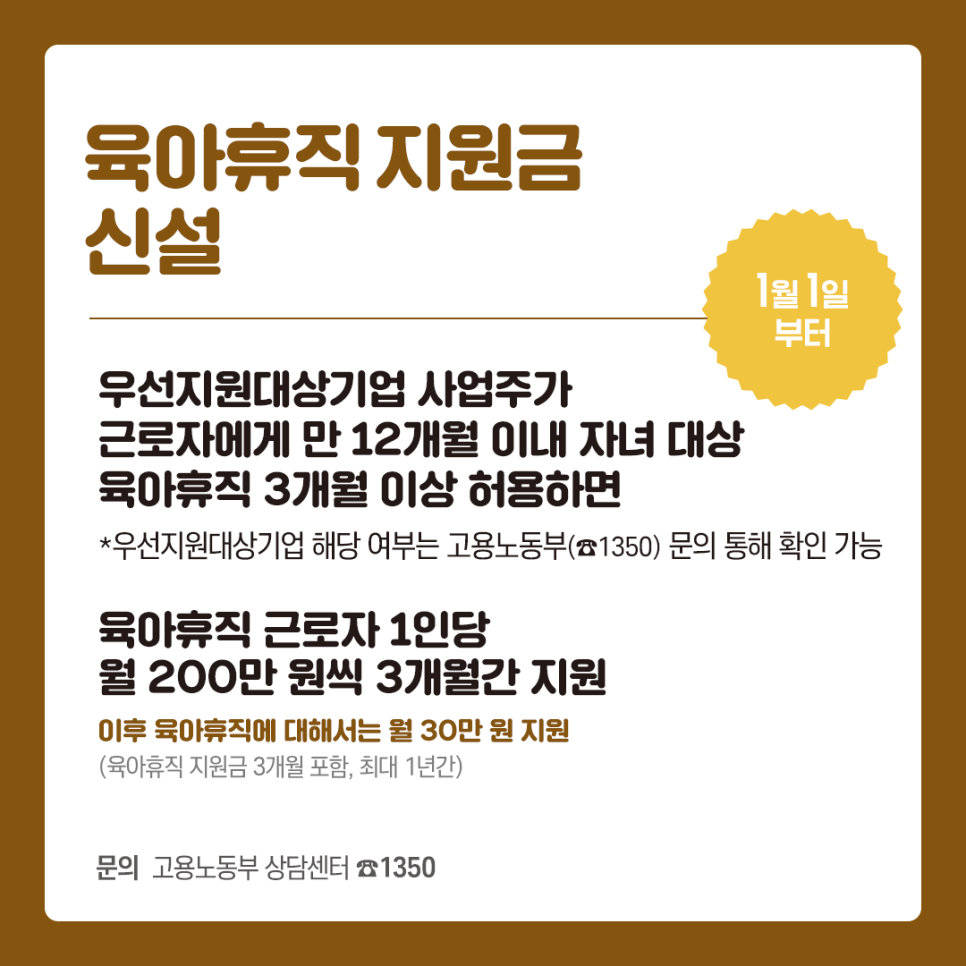만 12개월 이내 자녀에 대해 육아휴직 허용한 사업주에게 첫 3개월 동안 월 200만원 지급