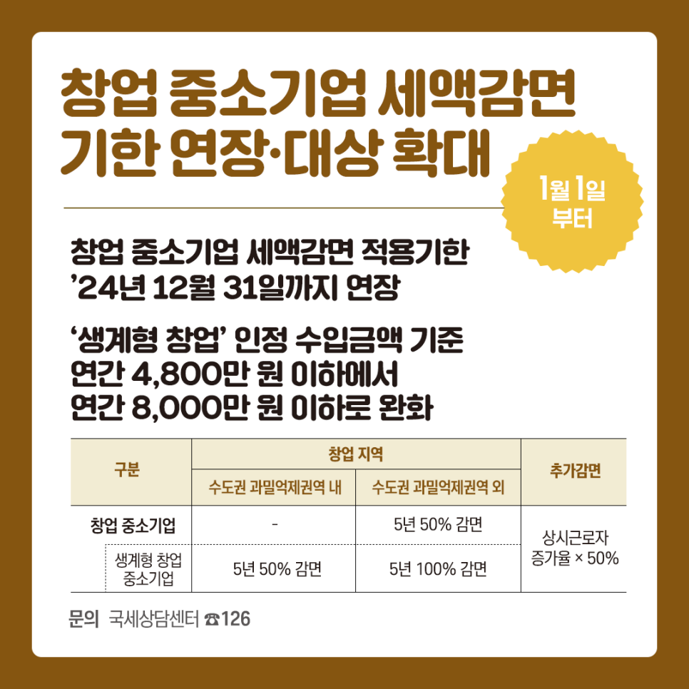 더 많은 창업 활성화 및 생계형 창업을 지원하기 위해 2021년 종료 예정이었던 창업 중소기업 세액감면 적용기한을 2024년 12월 31일까지 3년 더 연장 운영합니다.