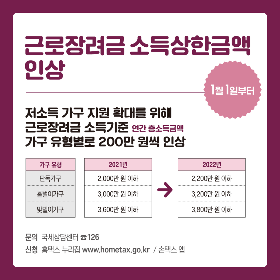 올해부터는 더 많은 분들이 혜택을 받을 수 있도록 근로장려금 지급대상 소득기준을 가구 유형별로 200만 원씩 인상합니다. 소득상한금액 인상은 2022년 1월 1일 신청분부터 적용합니다.