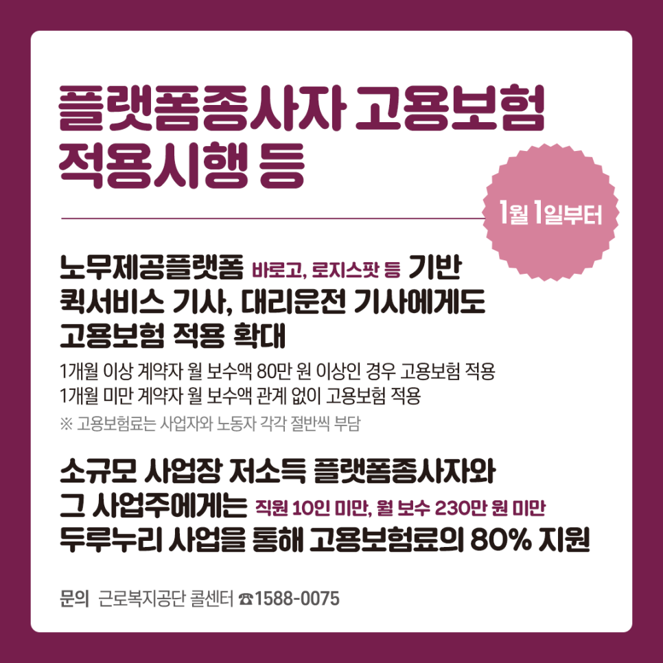 2022년 1월 1일부터 플랫폼종사자인 퀵서비스 기사(음식배달 기사 포함), 대리운전 기사도 고용보험 적용 대상에 포함합니다. 이를 통해, 구직급여, 출산전후급여 등 고용보험의 혜택을 받을 수 있게 되었습니다.