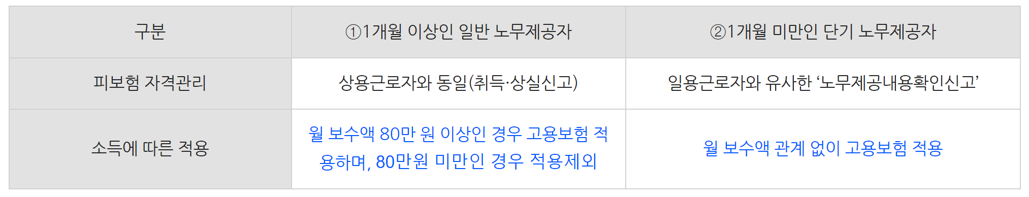 ①1개월 이상인 일반 노무제공자와 ②1개월 미만인 단기 노무제공자로 구분합니다.