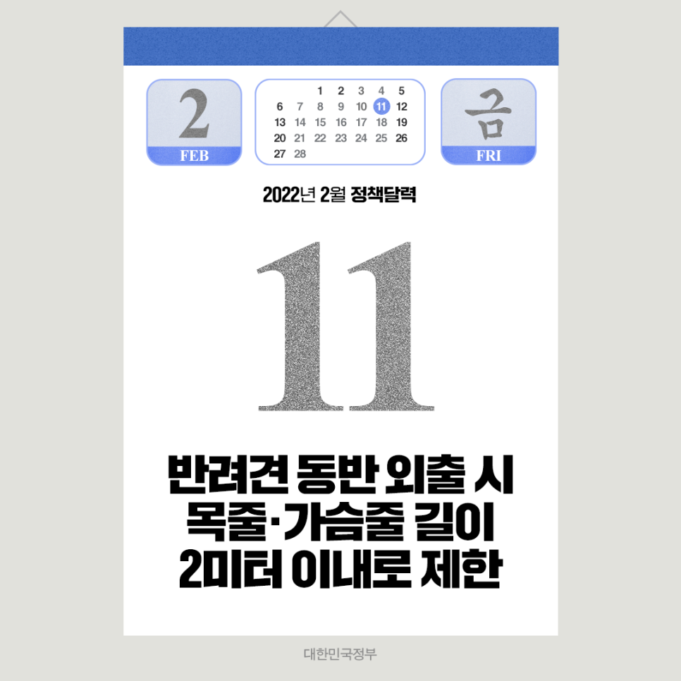 2월 11일(금)부터 반려견과 함께 외출할 경우, 목줄·가슴줄 길이를 2미터 이내로 제한합니다.