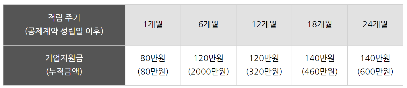 (기업지원금) 청약 승인일로부터 2년간 4회에 걸쳐 적립(6개월, 12개월, 18개월, 24개월 후)