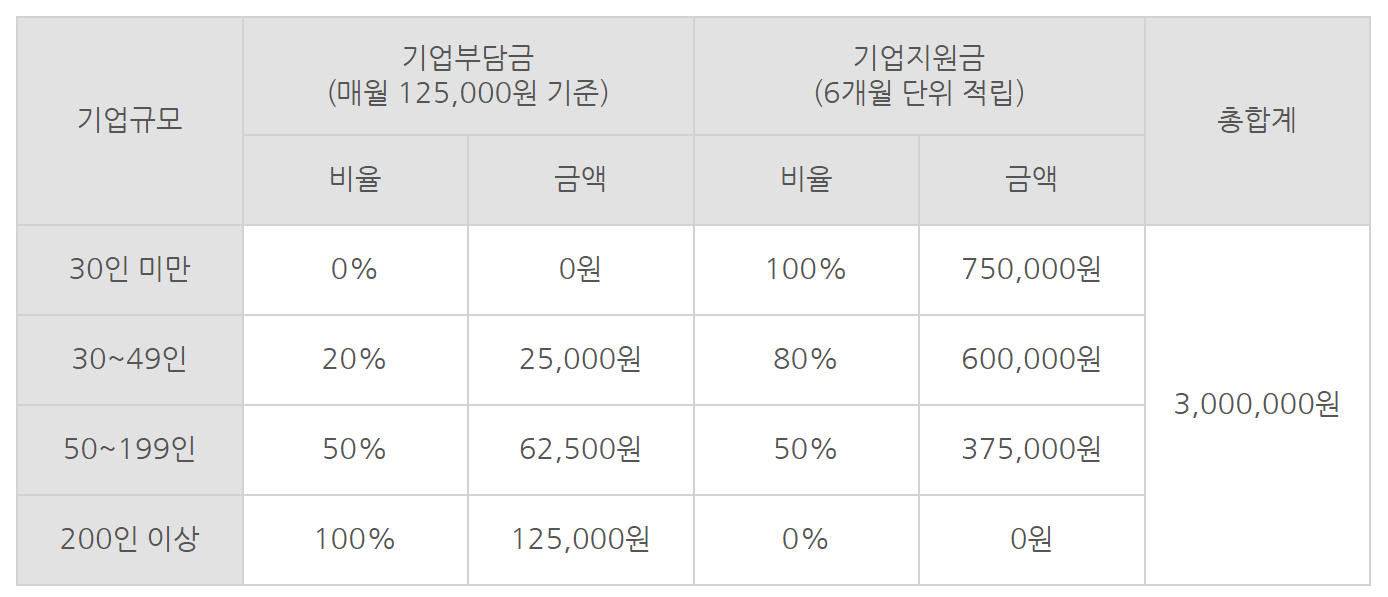 - 기업은 기업기여금의 20%를 적립(매월 2.5만원)