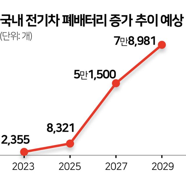 환경부는 2020년 275개에 불과했던 국내 전기자동차 폐배터리가 2025년 3만 1696개, 2030년에는 10만 7520개로 늘어날 것으로 전망했습니다.