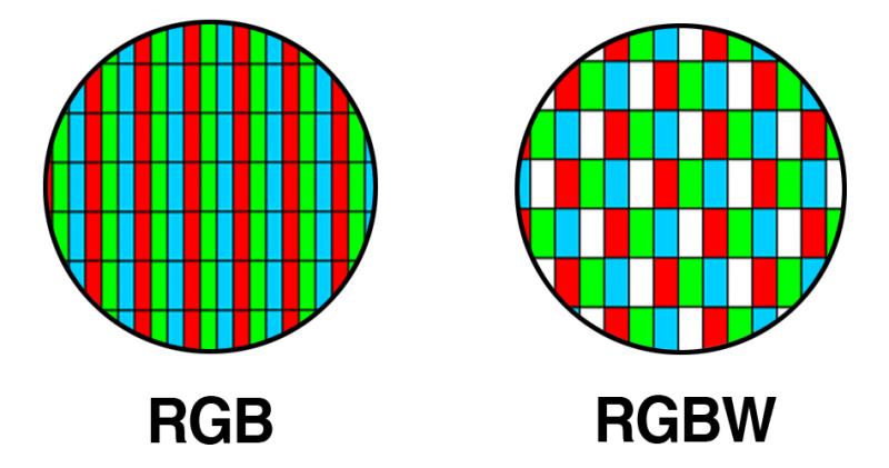 RGBW 방식은 높은 색재현율을 갖고 있으며, 고해상도 구현 시 유리하고, 흰색 배경 구현 시 소비전력도 낮은 특성이 있습니다.