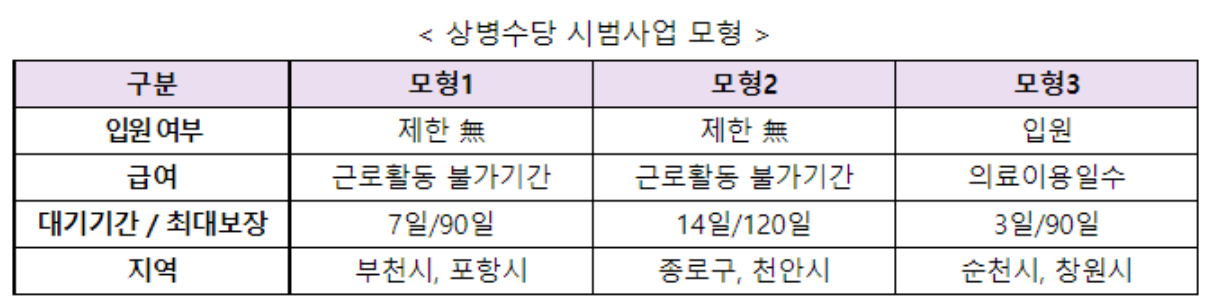 입원이 발생한 경우만 인정하고 해당 입원 및 외래 진료일수에 대해 상병수당 지급, 대기기간 3일, 최대 보장기간 90일