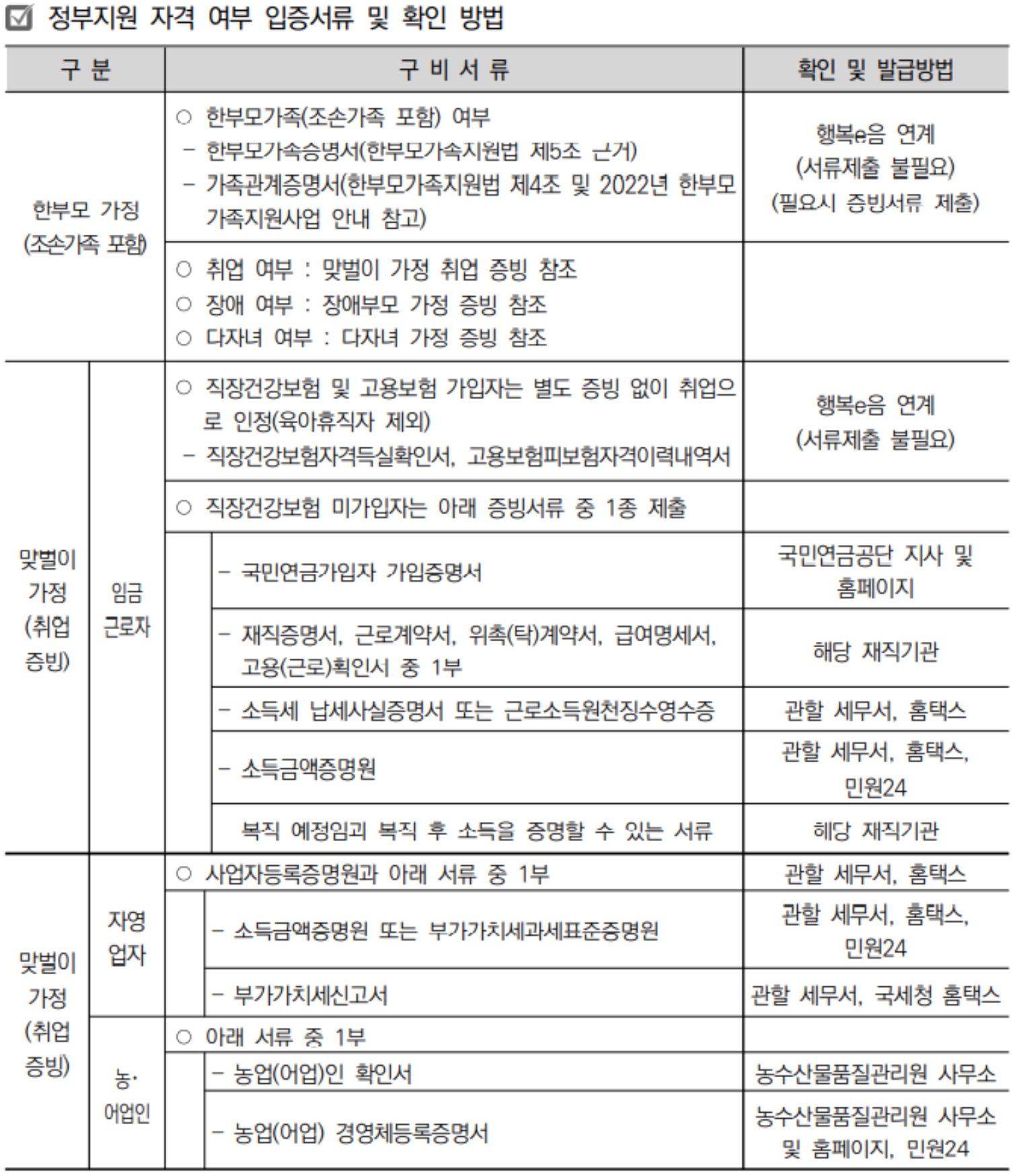 👉 맞벌이 가정, 한부모(취업・장애・다자녀)가정, 장애부모 가정, 청소년 부모 가정, 다자녀 가정, 기타 양육부담 가정임을 증빙하는 서류
