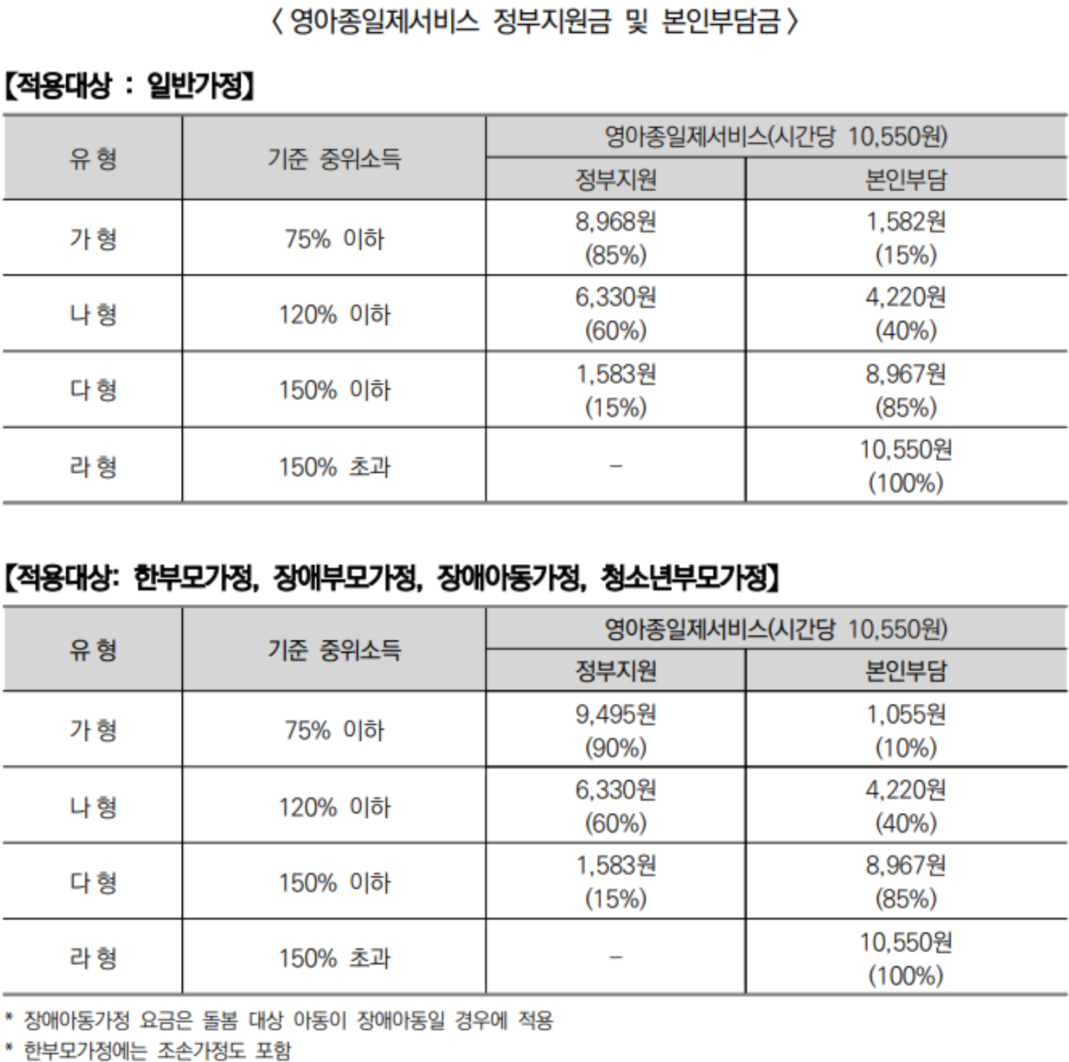 ◾ 연 840시간 이내 시간당 기본요금의 일부를 정부가 지원 (단, 중증장애 부・모의 자녀 대상 정부 지원시간은 960시간)