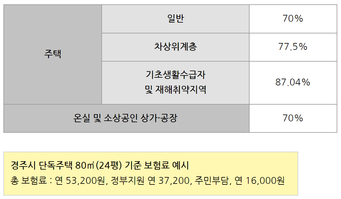 = 보험료는 거주하는 지역, 피보험자 소득 수준, 가입 대상 시설물, 보상금액 한도 등에 따라 달라지며, 정부와 지자체가 총 보험료의 70% 이상을 지원합니다.