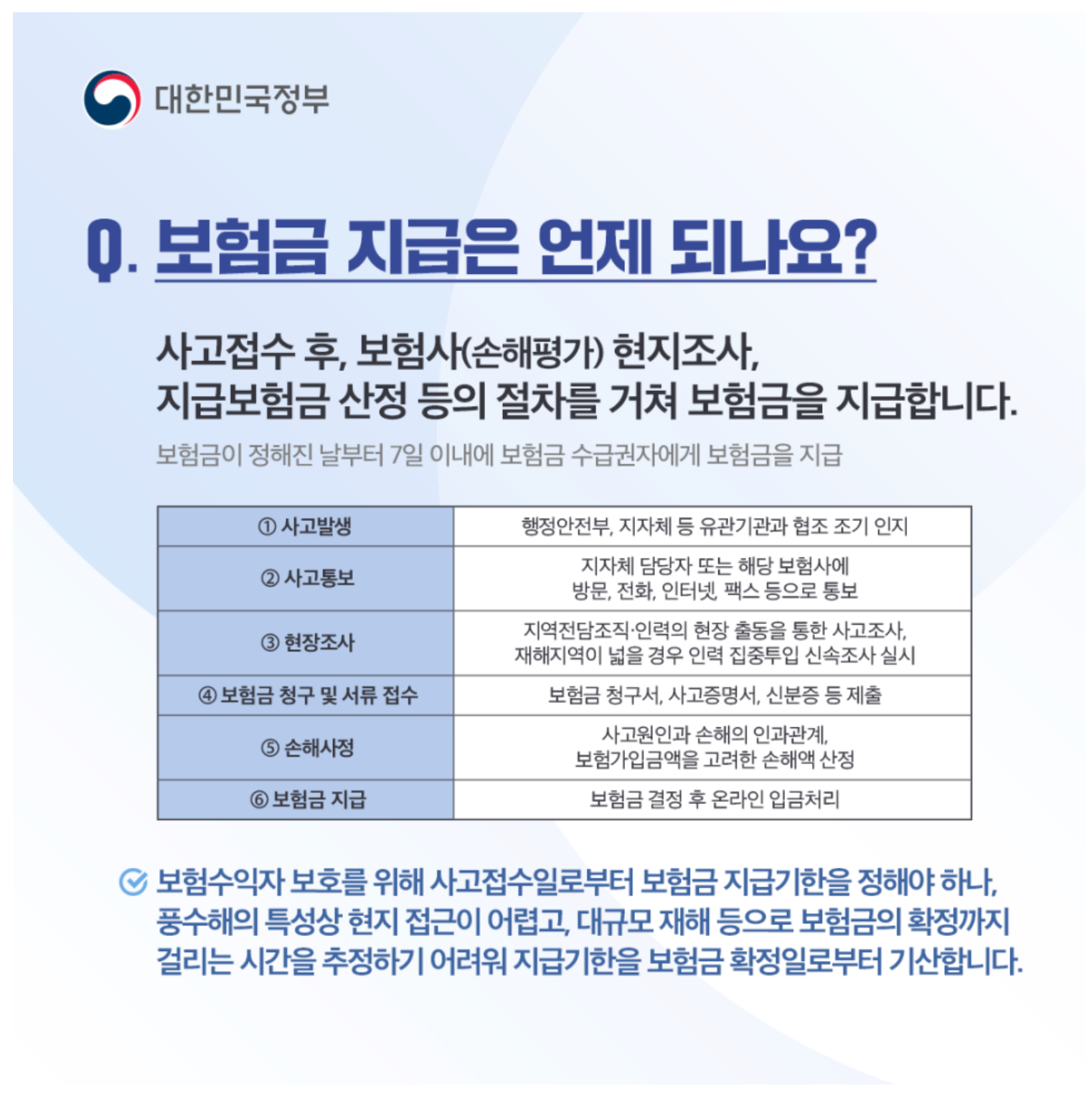 보험수익자 보호를 위해 사고접수일로부터 보험금 지급기한을 정해야 하나, 풍수해의 특성상 현지 접근이 어렵고, 대규모 재해 등으로 보험금의 확정까지 걸리는 시간을 추정하기 어려워 지급기한을 보험금 확정일로부터 기산합니다.
