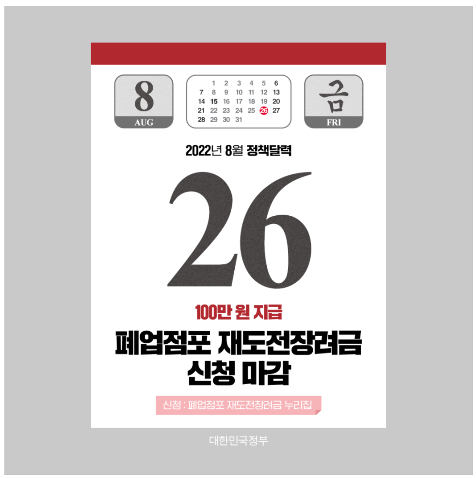 2021년 12월 방역조치 강화 이후에 폐업한 소상공인의 재기지원을 위해 폐업 소상공인 약 5만개사에게 100만 원씩 지원하는 '폐업점포 재도전장려금'사업 신청 접수가 8월 26일(금) 마감됩니다.